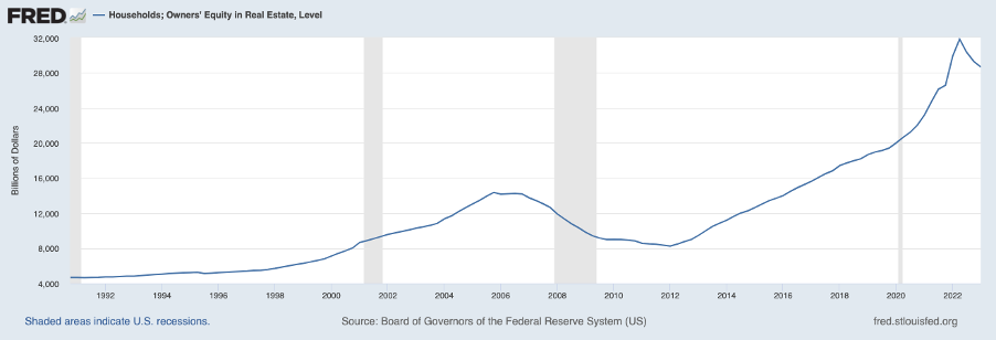 According to the Board of Governors of the Federal Reserve, the total household owners equity in the United States reached an astounding $28 trillion at the end of 2023. There is substantial wealth tied up in residential real estate across the country. To put this into perspective, the combined market value of all the homes in the US was estimated at $36.2 trillion in 2022. Homeowner equity represents a significant portion of the overall housing market.