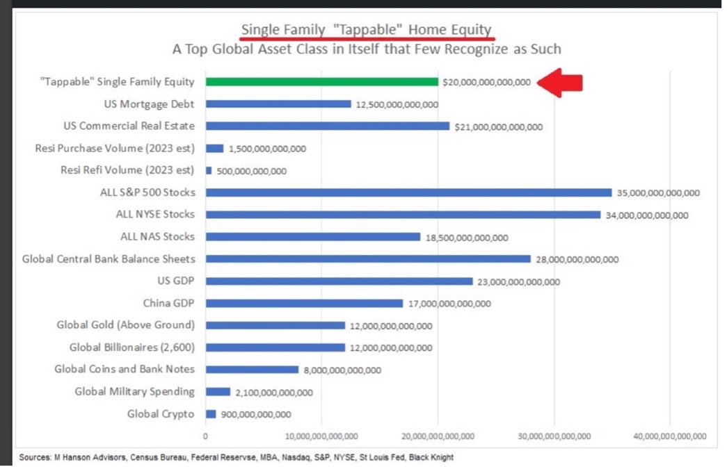 If we assume that a homeowner would be able to refinance their home based on current lending criteria then it gives us a number which is “tappable equity” which Trans union estimate at just under $20 trillion. Although other prominent research outlets suggest numbers lower than this it means that the average homeowner in the United States has $274k of equity in their home (Core Logic Homeowner Equity Report Q1 2023).