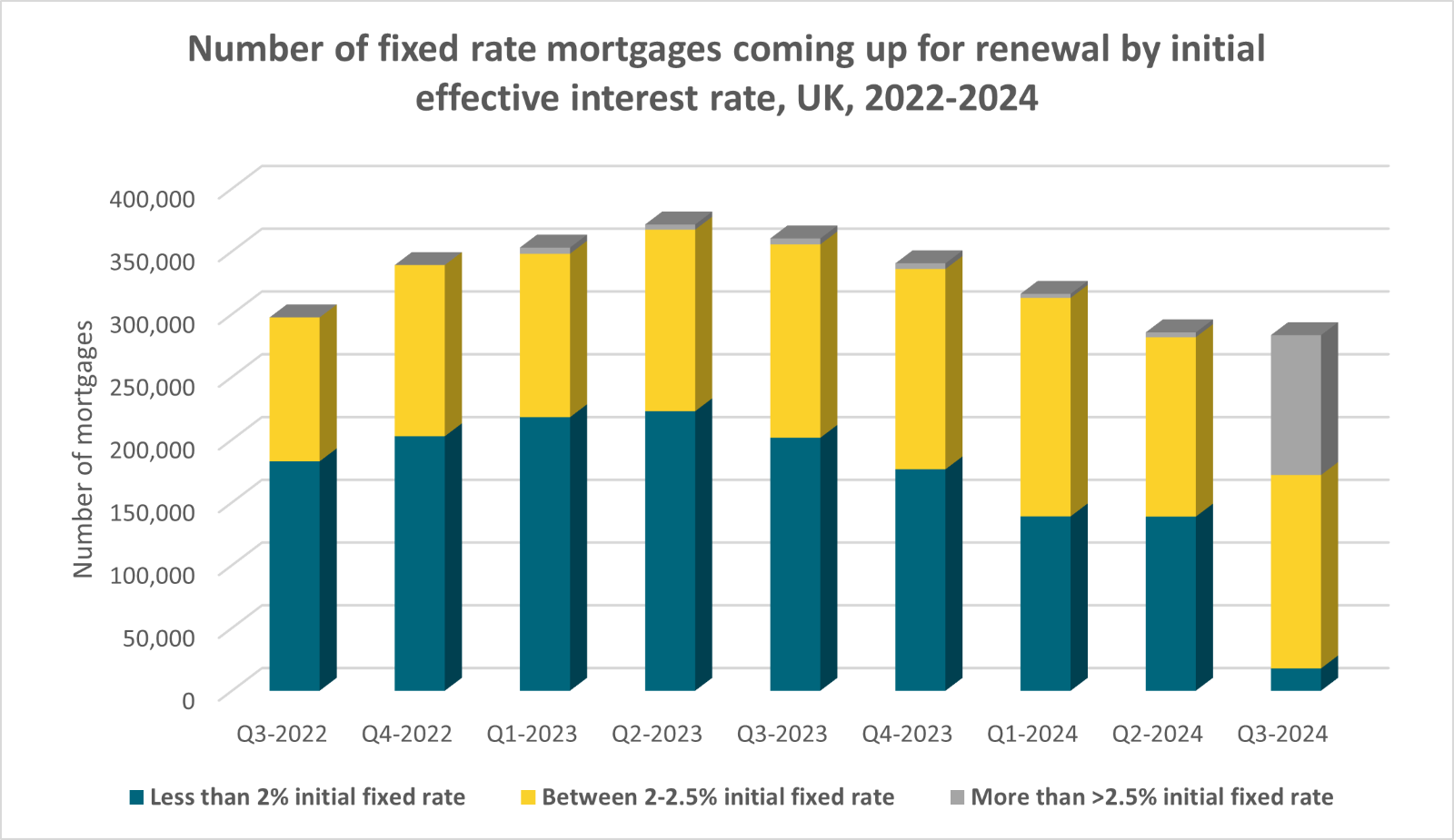 With almost two million UK homeowners on the brink of facing a significant increase in their cost of living due to a shift from previously low to sharply higher mortgage rates, the scenario looks grim. Data from the Office for National Statistics (ONS)1 reveal that a vast majority of borrowers coming to the end of their fixed rate mortgages in the first half of 2024 were on annual fixed mortgage rates of 2.5% or lower. With new rates likely to be much higher, the strain on households is intense. Monthly interest payments could potentially triple, further compounding the financial stress caused by the high inflation rate.