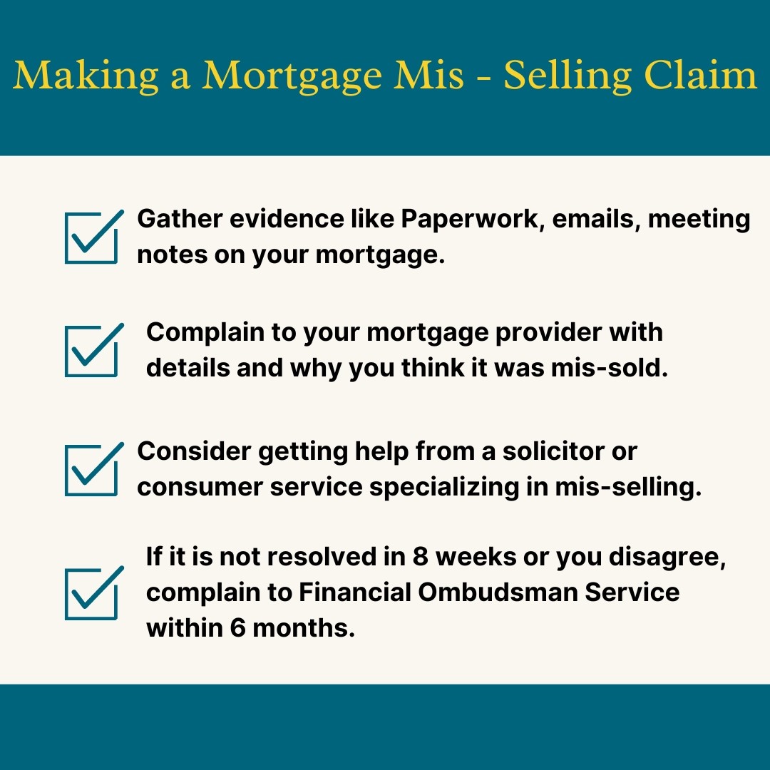 2. Make a complaint: File a formal complaint with your mortgage provider, stating the details of your case and grounds for your claim. Consider consulting with a solicitor or a consumer advisory service specializing in financial mis-selling cases. They can provide guidance on the strength of your claim and the best course of action.