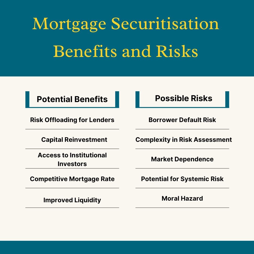 Mortgage securitisation offers several benefits to both mortgage lenders and borrowers. It allows lenders to offload mortgage risks from their balance sheets, freeing up capital that can be reinvested into new lending opportunities. Additionally, securitisation enables lenders to tap into a broad institutional investor base, potentially lowering their funding costs and allowing them to offer borrowers more competitive mortgage rates.